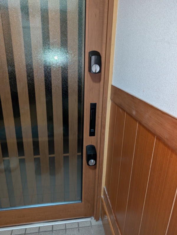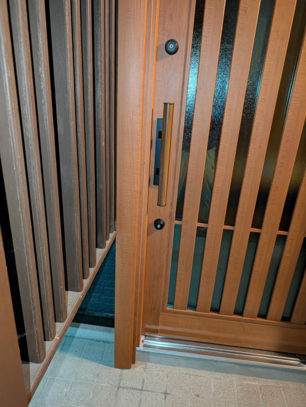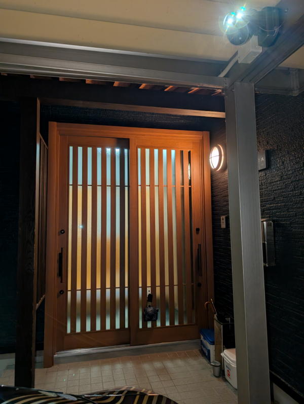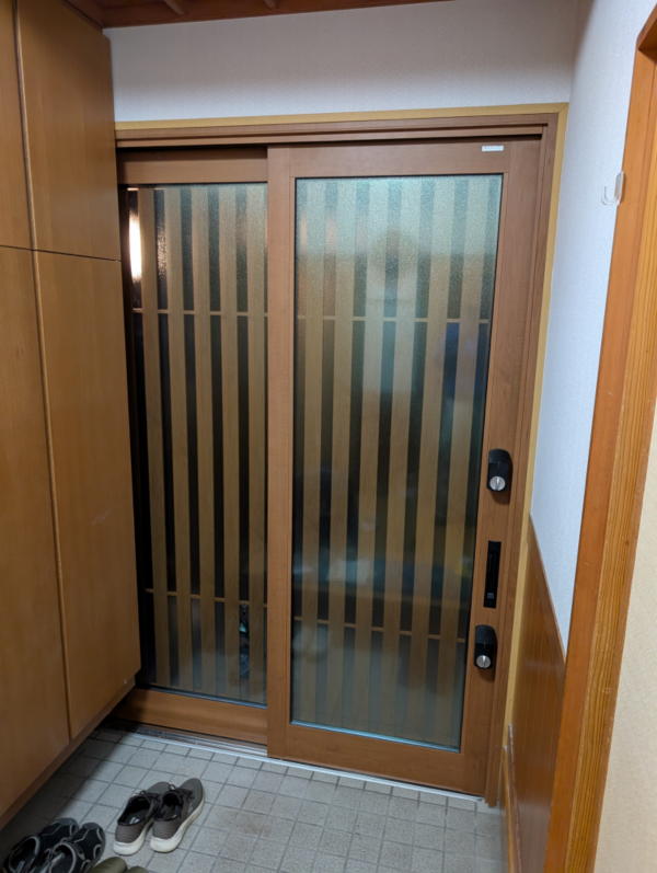 | 製品説明 | 一新助家のサイトのお問合せに”玄関引戸を交換したい”と連絡を頂き伺ってみると、三協の”銘峰”でした。シート貼の部材でしたが、シートがしわしわになって修復できないということで交換することになりました。 ただ、お父様(大工さん)の施工という建物で玄関収納を目一杯取りたいということで玄関枠ギリギリまできており、額縁無しの納まりでした。 カバー工法で取り替える場合、通常は内側の化粧カバーは額縁に納めますが、スペースがありません。そこで新枠を外側へセットバックさせ、化粧カバーの取付代を確保し、空いた土間は類似タイルで納め、外へ飛び出した下枠は補強し、さらにモルタル詰めでしっかりさせました。外の化粧カバーと既存格子の取り合いも隙間ゼロで納めました。また、錠前は2ロックの電池錠SLタイプをご採用いただきました。錠の設定はスマホアプリから行うもので、物理キー、リモコンに加えてスマホもキーになります。 お施主様に感想をお聞きすると”もう「ピッ」しか使わない! 大満足!”と喜んでいただきました。 受賞決定!! 第12回北陸一新助家ビフォーアフターキャンペーンにおいて 最優秀賞を受賞しました !! |