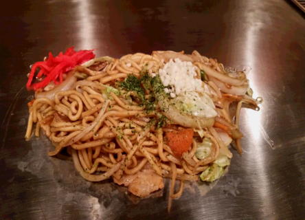 ゆでた麺に、炒めた野菜とソースをからめて、さらに炒めます。