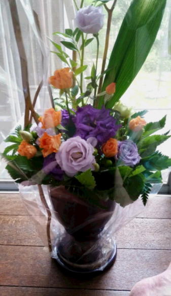 紫のトルコキキョウとオレンジのミニバラとグリーンを使ったアレンジです。濃い紫は暑そうだなと思える色ですが、オレンジのミニバラやグリーンをあしらうとなどをインパクトもあり、みずみずしさが加わって涼しさが増します。